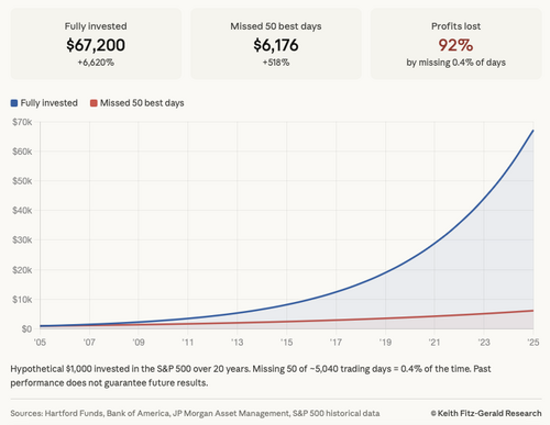 Imagine you’d invested $1,000 in the S&P 500 twenty years ago and missed just 50 of the best days over that entire time – a mere 0.4% – well guess what?